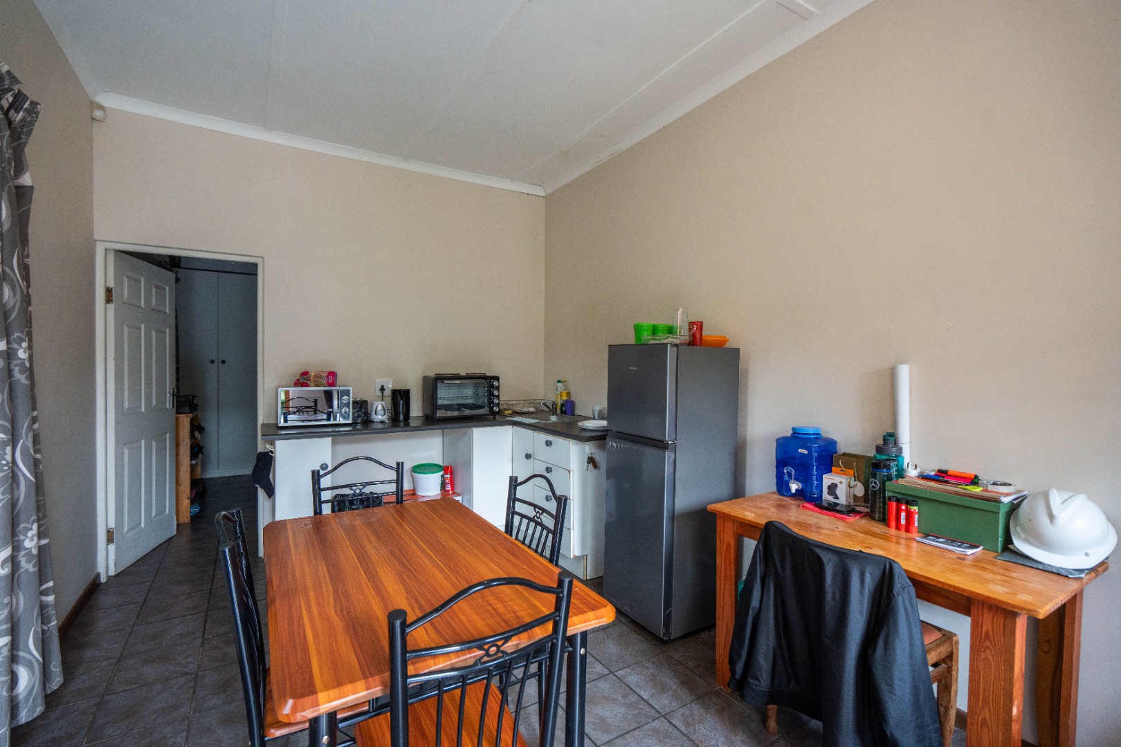 - Fridge, Stove, Bed, Desk and chair.